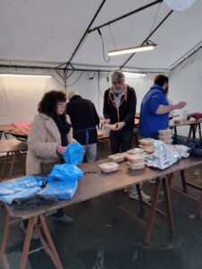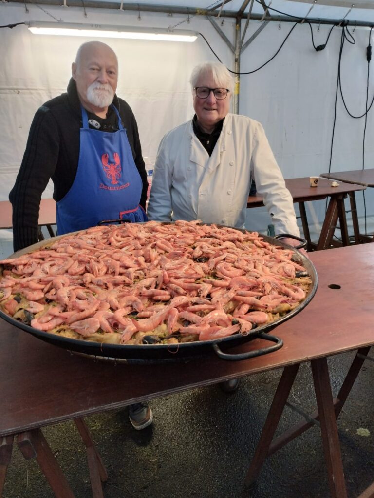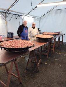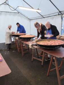 Prenez du riz, des crevettes, du poulet, des tomates, des poivrons, une grande gamelle ou plusieurs, selon le nombre de convives, une dose de bonne volonté du chef et de ses commis, de l’huile de coude et la bonne humeur des bénévoles et vous réaliserez une délicieuse paëlla.