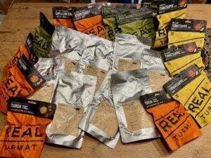 On a ainsi des plats lyophilisés d’une marque norvégienne ; poids restreint, juste de l’eau chaude à verser ; des plats apertisés en provenance de Carnac chez Nomads kitchen, et du Gers qu’on réchauffe en mettant le sachet dans l’eau chaude.
